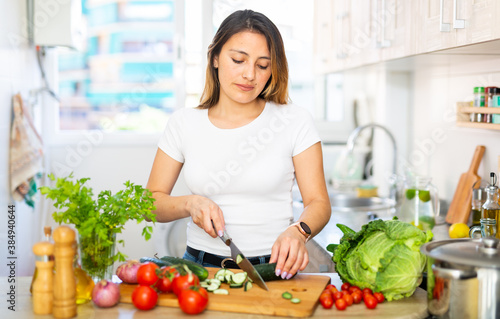 homemaker, happy, cooking, latino, fresh, vegetable, food, kitchen, people, female, young, woman, alone, casual attire, decoration, hobby, cookery, diet, tasty, nourishment, prepare, dinner, smile, well-being, housekeeping, summer, interior, domestic, house, tomatoes, 1, cutting, board, pan, salad, knife, spice, brazilian, chilean, ordinary