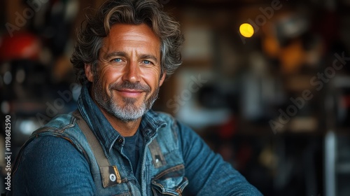 man, portrait, garage, workshop, motorcycle, smiling, happy, mature, mechanic, grey, hair, male, person, adult, blue, eye, jean, vest, confident, relaxed, lifestyle, background, industrial, tool, repair, automotive, rider, machinery, engineering, technology, power, strength, freedom, adventure, passion, hobby, life events, skill, work, job, professional, career, success, style, image