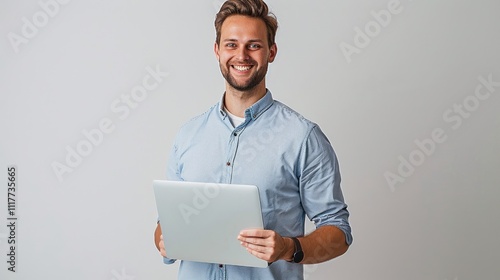 man, laptop, computer, technology, portrait, smiling, happy, professional, business, digital, workplace, modern, studio, shot, success, cheerful, content, positive, joyful, optimistic, confident, person, male, model, attractive, photogenic, casual attire, style, shirt, blue, grey, background, image, photo, picture, photo