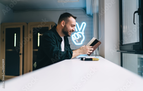 Smiling man reading notes in notepad and sitting at side counter in office