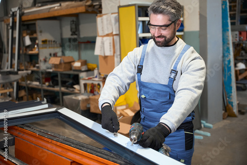 Smiling man with a drill at the workplace in workshop