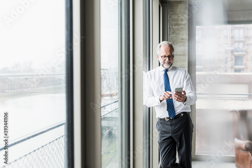 Smiling mature businessman standing at the window using cell phone
