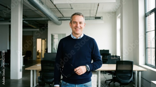 Smiling middle aged man standing in empty modern office with large windows and open space