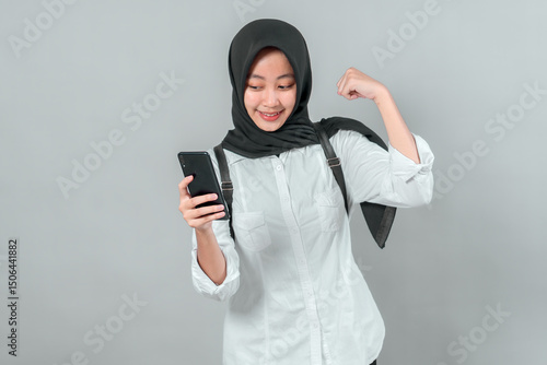 muslim, student, girl, smartphone, phone, female, teenage, happy, smiling, flexing, arm, strong, confidence, success, motivation, education, digital, lifestyle, back to school, youth, southeast asia, indonesian, modest, attractive, schoolgirl, online, learning, modern, communication, cyberspace, academic, remote, cheerful, casual attire, technology, victory, celebration, energetic, white shirt, backpack, proud, classroom, power, islamic, mobile, expression, determined, positive