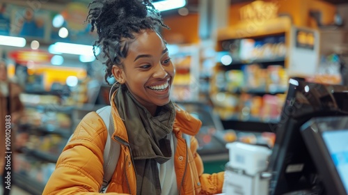 shopper, smiling, discount, checkout, client, store, happy, transaction, retail, purchase, excitement, gratitude, product, service, cashier, joyful, savings, buying, friendly, atmosphere, shop, grocery, happiness, expression, interaction, clothing, grocery, life events, casual attire, woman, indoor, young, person, fun, shopping, enjoy, market, counter, aisle, merchandise, sale, lifestyle, community, place, engagement, response