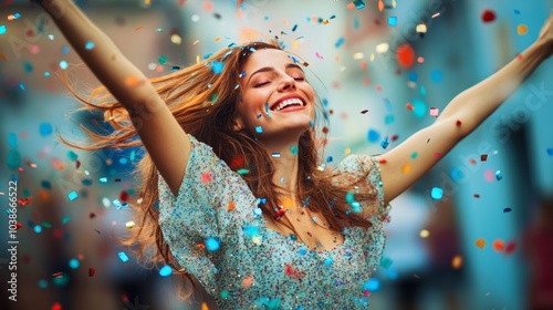 Smiling Woman Dancing Under a Shower of Glitter with Sunset in Background