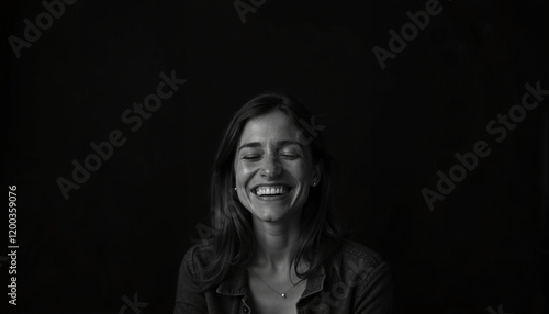 woman, smiling, joy, happiness, black background, portrait, expression, beauty, facial, emotion, laughter, female, cheerful, youthful, candid, friendly, positivity, relaxed, enjoyment, satisfaction, hair, earring, jewellery, natural, carefree, closeup, confidence, personal, dark, light, joyful, warmth, captivating, expressive, vibrant, high contrast, black-and-white, radiant
