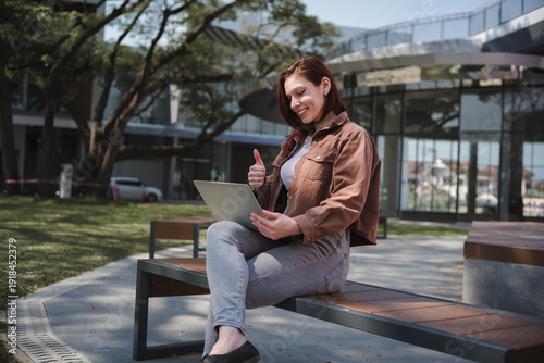 woman, smiling, thumb, up, laptop, working, video, call, remote, work, communication, success, approval, happy, park, bench, technology, cyberspace, student, learning, digital, nomad, freelancer, professional, business, online, connectivity, modern, casual attire, youth, confidence, agreements, satisfaction, positive, young, adult, content, wireless, urban, corporate, building, lifestyle, businesswoman, entrepreneur, manager, employee