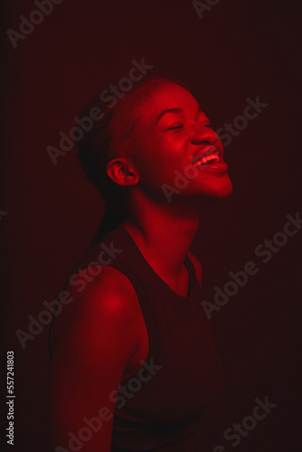 woman, cheerful, eyes closed, smile, appearance, room, dark, red, light, to illuminate, positive, style, female, african american, black, top, young, feminine, brunette, dark hair, ethnic, pleasure, coiffure, black hair, slim, outfit, inside, individuality, long hair, mood, racked, tranquil, braid, toothy smile, alone, sincere, model, vertical, indoor, half face, portrait