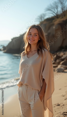Smiling Woman in Neutral Outfit by the Ocean