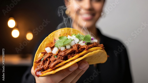 Smiling Woman Offering Steaming Birria Taco Close-up. Focus on Delicious Shredded Beef Quesa Taco Topped with Cilantro and Onion. Happy Moment, Authentic Mexican Food, Ready to Eat.