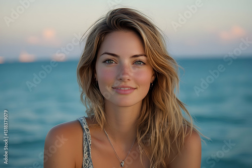 woman, blond, hair, freckle, smile, ocean, sunset, portrait, beautiful, natural, beauty, people, face, eye, light, gold, hours, outdoors, sea, water, calm, peaceful, happy, pretty, attractive, fashion, summer, beach, style, girl, model, coastline, photo, view