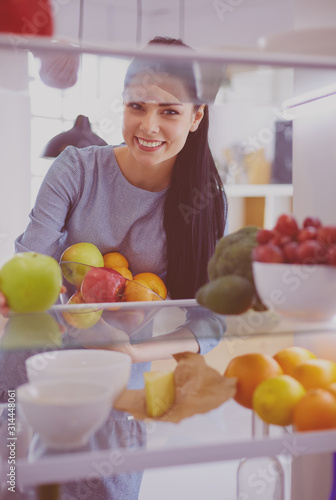 Smiling woman taking a fresh fruit out of the fridge, healthy food concept