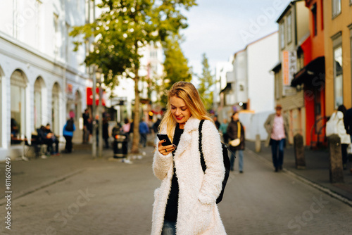 Smiling woman using mobile phone on the street.