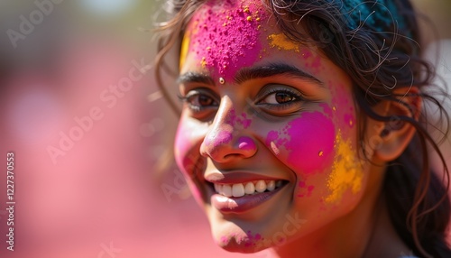Smiling woman with colorful face at Holi festival, joyful celebration portrait