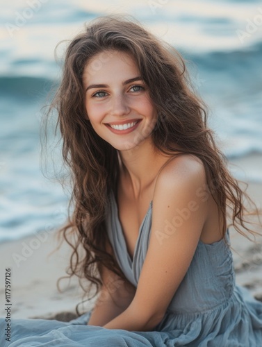 woman, smiling, long, wavy, hair, grey, dress, sandy, beach, turquoise, wave, bright, empty, copy space, text, design, sitting, beautiful, nature, sea, water, summer, joy, happiness, leisure, relaxation, lifestyle, coast, shore, scenery, portrait, feminine, casual attire, sunny, atmosphere, serene, tranquil, vacation, enjoyment, carefree, style, model, beauty, elegance, fashion, environment, landscape