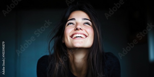 smiling, young, caucasian, woman, upward, female, happy, portrait, cheerful, confident, brunette, dark, setting, expression, joy, eye, teeth, positive, face, indoor, vibrant, mood, natural, beauty, black, sweater, hair, laughter, emotion, soft, gaze, energy, hope, serene, youthful, bliss, happiness, content, introspective, engaging, liveliness, candid, relaxed, authentic, radiant, charme