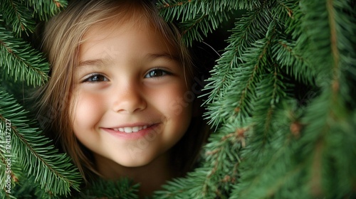 Smiling young girl peeking through vibrant green fir branches in a serene natural setting, capturing innocence and joy, soft lighting.