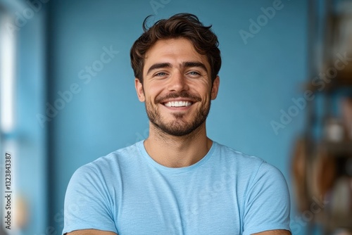 Smiling young man in light blue t-shirt with crossed arms laughing in studio portrait