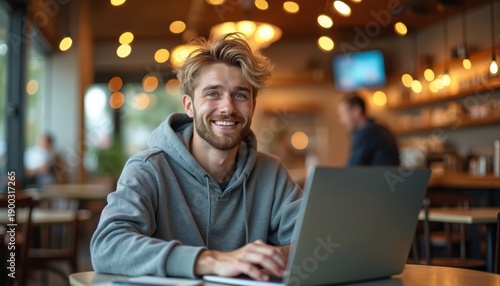 Smiling young man with blonde hair types on laptop at cafe table. He wears grey hoodie, looks at camera. Blurred background shows warm lighting, cafe interior. He is engaged in remote work or study.