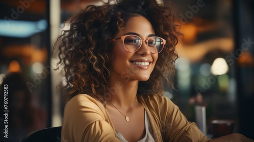 Smiling young mixed race woman wearing glasses looking out of a window while sitting at counter in a cafe sunny summer evening or morning
