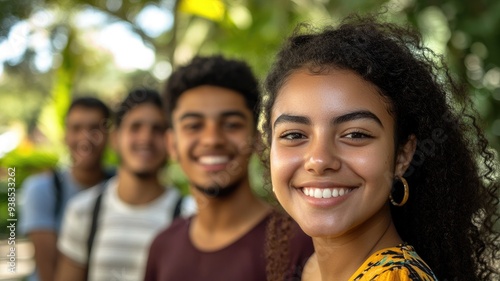 Smiling young people lined up outdoors, lush greenery background