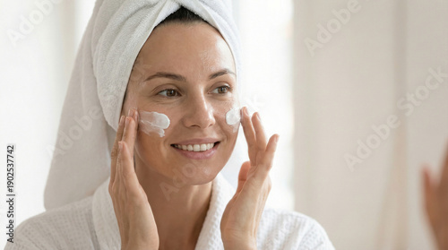 skincare, face cream, moisturiser, beauty, woman, bathrobe, towel, facial, skincare, spa, cosmetic, hygiene, hydratation, treatment, wellness, smiling, natural, bathroom, lotion, portrait, dermatology, glow, female, adult, lifestyle, soft