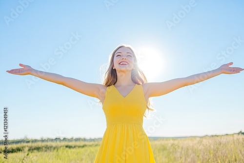 smiling young woman in bright yellow dress standing in sunlit field arms stretched wide under clear blue sky