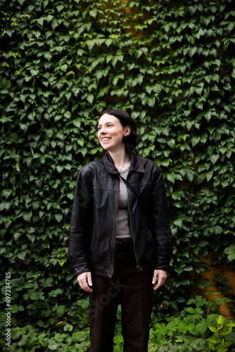 public park, casual clothes, day, one person, europa, photo, front view, avocation, color image, delight, hedge, jacket, smiling, lifestyle, happiness, leaf, nature, vacation, scandinavia, stockholm, standing, vertical, sweden, looking away, missy, young adult, outdoors, plant