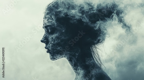 portrait, woman, smoke, aethereal, dark, mysterious, haunting, beautiful, monochrome, art, artistic, creative, surreal, fantasy, abstract, emotion, feeling, contemplative, pensive, soul, spirit, intangible, vapour, cloud, grey, blue, fine art, head, profile, half face, shadow, darkness, light, contrast, moody, atmospheric, dreamy, enigmatic, visage, face, expression, serene, calm, introspective