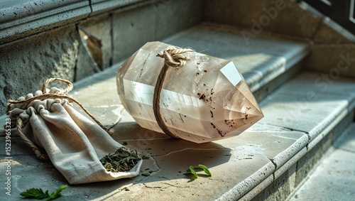 crystal, quartz, smoky, gemstone, herb, pouch, bag, linen, stone, stair, sunlight, healing, energy, magic, spiritual, sacred, nature, raw, geology, mineral, twine, tied, ritual