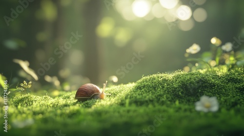 Snail on mossy forest floor bathed in sunlight