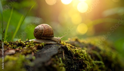 Snail on mossy log in sunlit forest