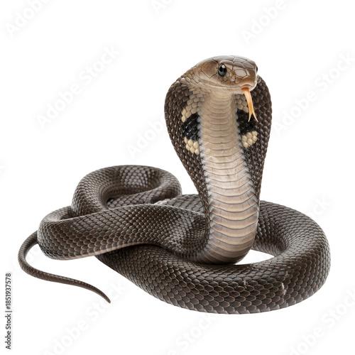Snake on transparent background close-up. Venomous cobra with spread hood and fangs visible.