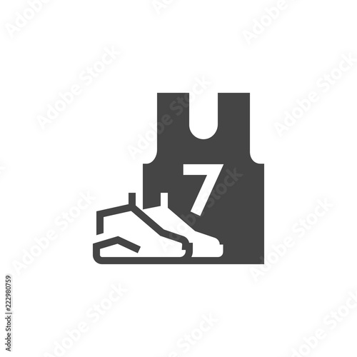 Sneakers and T-shirt with number 7. Black flat icon of sportswear. Unisex uniform for members of team games. Emblem of casual clothes for shops. Vector illustration isolated