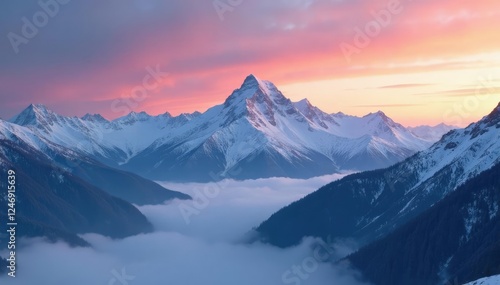 Snow capped mountains at sunrise with misty veil, mountain, natural