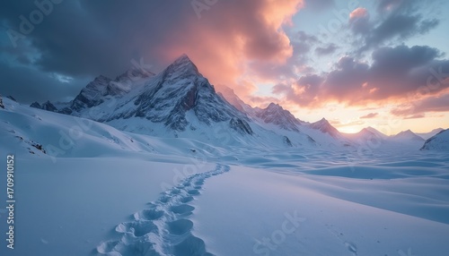 Snow covered mountain range at sunrise or sunset. Footprints mark a clear path through untouched snow towards majestic peaks. Serene, cold, vast winter wilderness.