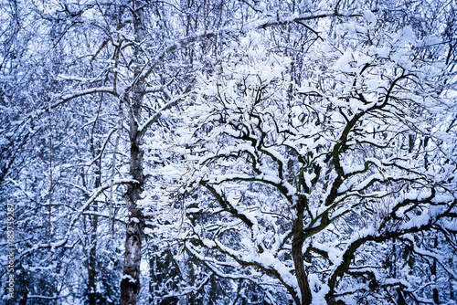 Snow covered trees in a winter forest coated in fresh white snow. A peaceful, cold seasonal landscape with natural patterns and textures. Selective focus.