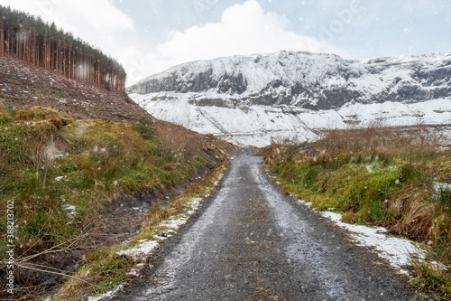 Snow flakes falling on a small asphalt road which leads into mountains covered with snow. Nobody. Gleniff Horseshoe Drive, county Sligo, Ireland