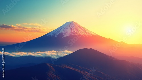 Snow-capped Mount Fuji glowing in the first light of dawn, with intricate, realistic textures and a peaceful atmosphere.