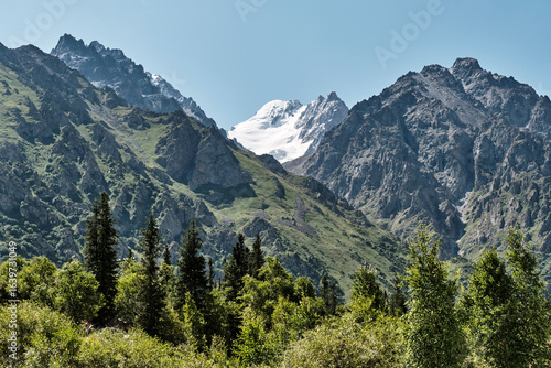 Snow-capped peak and lush forest in alpine Ala-Archa national park, Kyrgyzstan