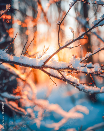 Snow-covered branches illuminated by warm sunset light in winter scenery