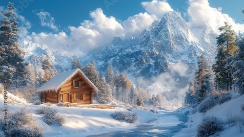 Snow-covered cabin, frozen river, majestic winter mountains.