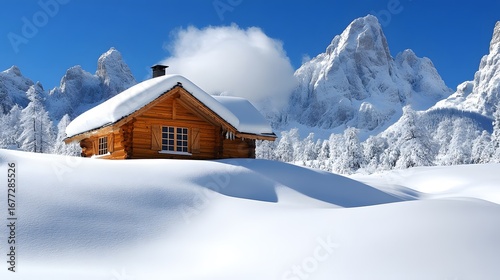 Snow-covered cabin nestled among majestic mountains in a serene winter landscape at midday