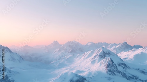Snow-covered mountains under a clear winter sky, with the soft light of dawn illuminating the peaks