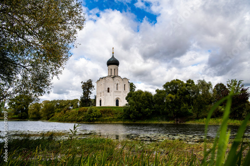 snow-white stone old church against the background of a green meadow and lake before a summer thunderstorm