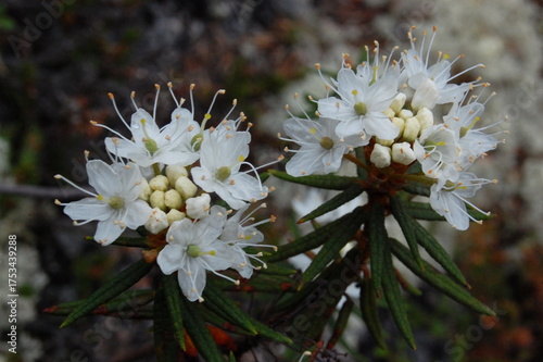 Snow-white wild rosemary flowers in the forest on a summer day.