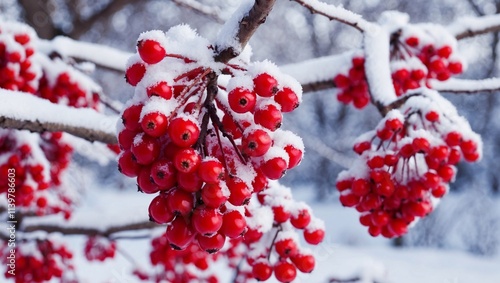 Snowy bunches of red rowan berries on rowan tree in winter landscape. Frozen tree scene, natural abstract background. Winter season. Cold weather.