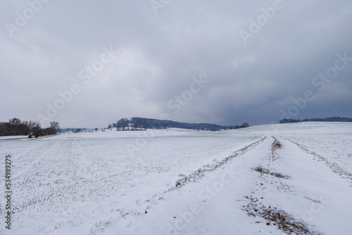 snowy field path with cloudy sky in Schmuttertal biotope near the village of Gablingen near Augsburg in Bavaria, Germany