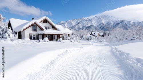 Snowy mountain chalet, winter road, scenic view, holiday escape